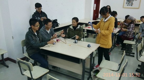 在活动中,同学们被分为6个小组,各组有1名学生会女工部部员负责教学。教员们教授了围巾编织的起针及其他最基本的针法,学员们认真地学习,并及时提出编织过程中遇到的问题,教员们也对同学们提出的问题进行了耐心的指导。接着,教员根据学员们的个人喜好提出自己的建议,同时开始逐个教授不同的围巾编织方法。学员们情绪高涨,用心学习,全身心地投入到编织之中。看着手中那一团杂乱无章的毛线渐渐的转变为一条可以保暖的围巾,每个人的脸上都洋溢出满意的笑容。 学习期间,同学们之间相互交流,相互切磋,争取将自己的作品完成的更加完美。