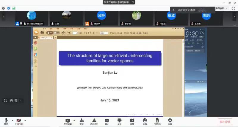7月15日上午,北京师范大学吕本建副教授应邀为新葡萄官网师生作题为“The structure of large non-trivialt-intersecting families for vector spaces”的线上报告(腾讯会议形式)。报告由数学系王健主持,新葡萄官网图论方向的教师与研究生参加了报告会。
