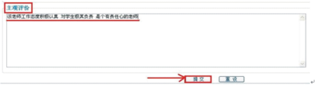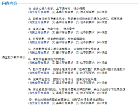 网上评教总共十题,每题最高10分,最低2分,有五个分值选项。最下面的“主观评价”栏目中学生可填写对教师的主观评价。如下图2-2所示。
